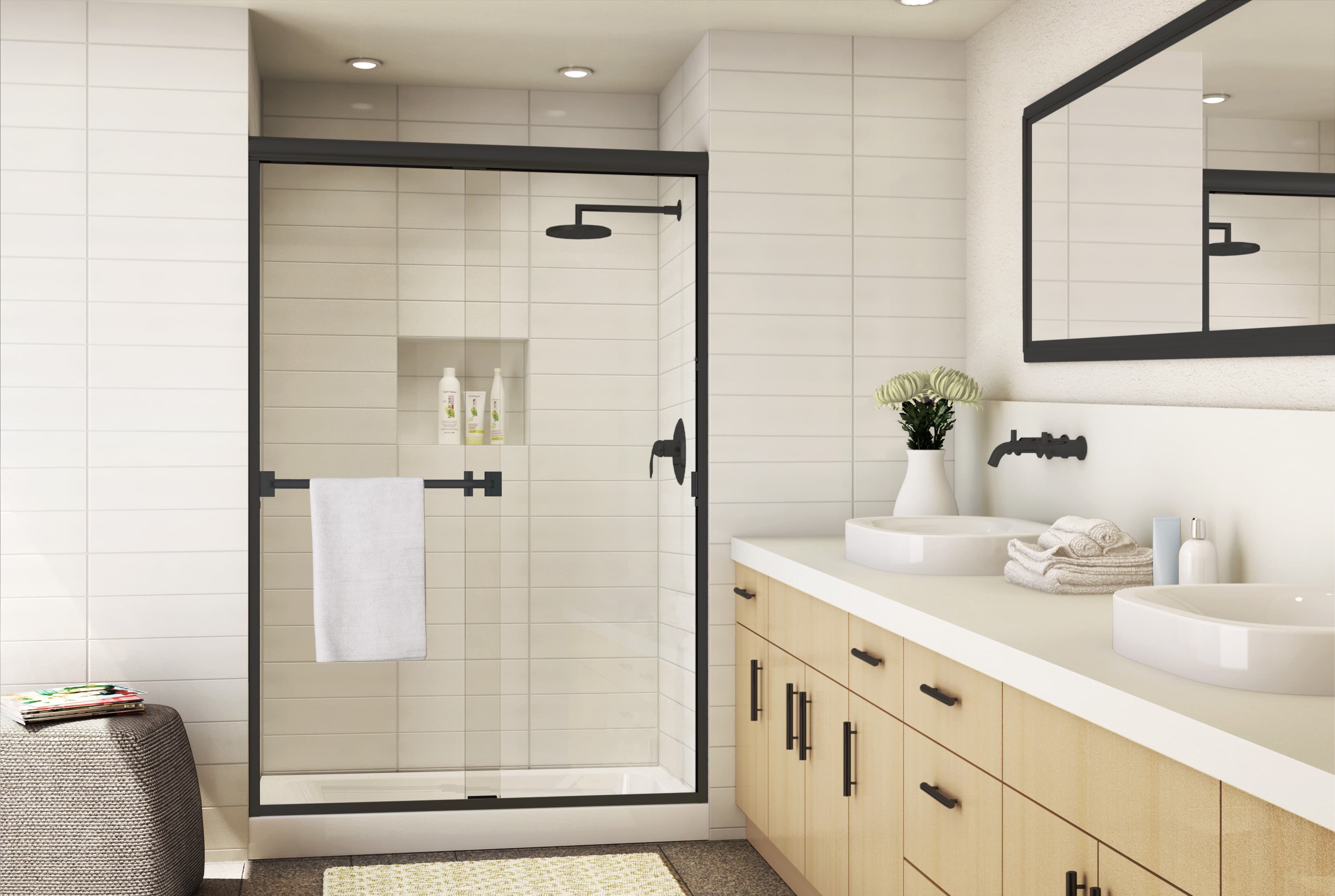 Frameless enclosures are a great choice for large, high-end bathrooms, while framed doors offer better leak prevention at a lower cost. If you don’t have enough room for an out-swinging shower door, you should consider a sliding enclosure.
