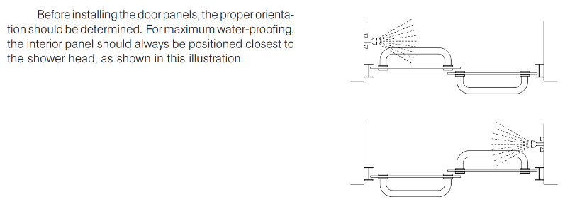 For maximum water proofing, shower head spray should be positioned away from gaps in sliding doors (shown above.